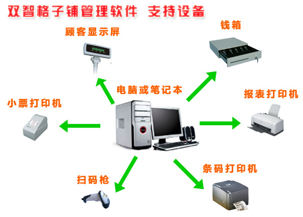 支持设备: 扫码枪,小票打印机,激光打印机,喷墨打印机,条码打印机,收银箱,顾客显示屏.